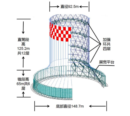 該公司1號間冷塔由“錐體+展寬平臺+圓柱體+加強環”四部分組成,主體結構共18層,總高190.2米,錐段為6層,直筒段為12層,由576榀鋼三角和全鋼蒙皮拼裝而成,零米以上主體為全鋼構架,自重6500余噸。