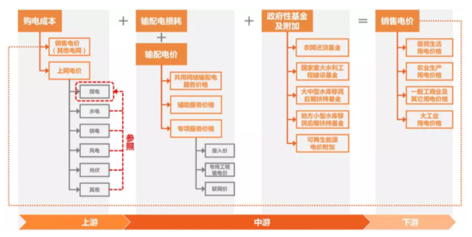 從上圖可以看出,用戶的用電價格,即用戶側的銷售價格,由三部分構成: