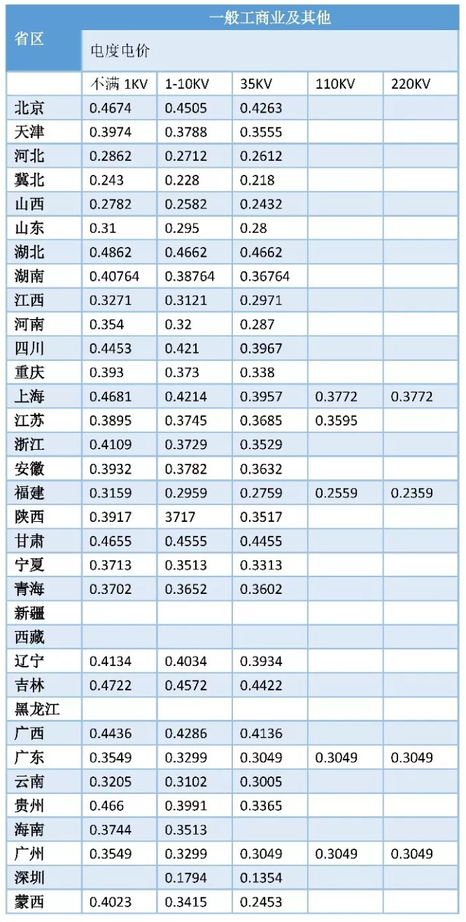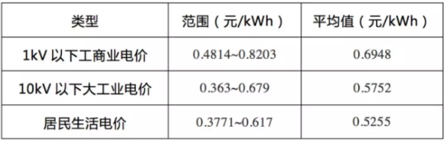 不同用電戶的銷售電價差異很大,工商業電價、大工業電價、居民電價均為電網的銷售電價,全國的平均水平如下表。