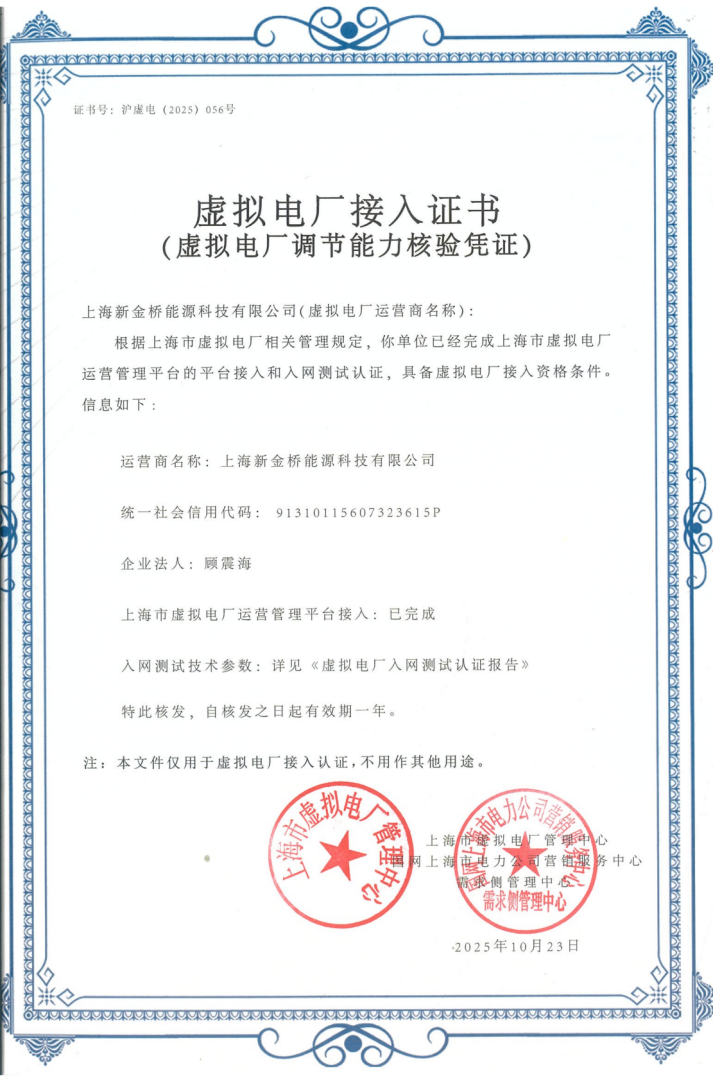 近日,上海新金橋能源科技有限公司順利通過上海市負荷管理中心及電力交易中心技術準入,成功獲得“虛擬電廠運營商資質”,成為上海市第56家虛擬電廠運營商。這一里程碑式成果的達成,得益于新金橋能源與千瓦科技彼此在技術方案與資質申報環節的緊密配合和專業努力。