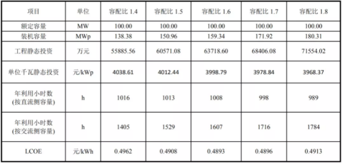 既然容配比的作用這么大,是不是可以無限擴大容配比呢?其實不是這樣的。以典型中部地區合肥為例,采用固定式+單面組件+集中式逆變器,可以發現容配比為1.6的情況下,光伏度電成本最低,故選擇1.6為最優容配比。