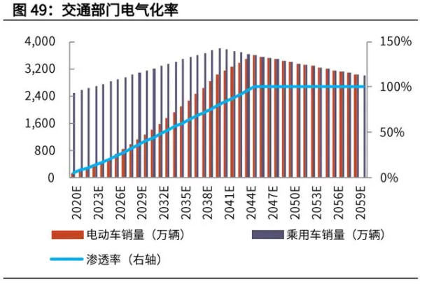 鋼鐵、電解鋁、水泥等行業是能耗大戶,也是碳排放大戶。鋼鐵行業的電氣化路徑主要是從高爐轉向電爐,電爐及其設備、耗材仍具有較好 的投資機會。根據鋼協數據,2019 年我國鋼鐵行業 90%以上的產能采用高爐 (BOF)技術,而電爐技術(EAF)僅占生產總量的 9%。特別是以廢鋼為原料 的短流程煉鋼技術,碳排放量僅 0.4 噸二氧化碳/噸鋼,若使用綠色電力為電爐 供能,則碳排放量可降為 0。水泥的生產過程中需要將水泥窯加熱到 1600 攝氏度以上,目前電爐的使用尚未 商業化,投資成本較高。目前較為可行的方法是用沼氣、生物質替代化石燃料。從建筑屬性來看,可以分為公共建筑、城鎮居民建筑和農村居民建筑。從用途來 看,供熱、制冷、烹飪是中國建筑部門的主要能源消費來源。建筑部門的電氣化 率仍較低,2017 年僅為 28%。目前,制冷、照明、家電已經實現了 100%電氣化,供暖和烹飪的電氣化推進較 為緩慢。我國北方城鎮普遍實行集中供暖,主要熱源為燃煤熱電聯產和燃煤鍋爐。自 2017 年以來,我國北方地區推行“煤改氣”、“煤改電”,對建筑部門的電 氣化有一定的推動作用。炊事方面,根據清華大學建筑電氣化接受程度調研,一方面,住宅炊事用能逐漸 向公建轉移,應關注公建餐廳電氣化;另一方面,住宅炊事電氣化最大難點在于 改變用戶習慣。總之,建筑部門電氣化需綜合考慮公共部門與居民住宅,也要考慮南北方氣候差 異。隨著人民生活水平提高,家用電器的數量和使用強度呈上升趨勢。未來采暖 電氣化應逐步替代燃煤鍋爐,炊事電氣化應重點關注餐廳電氣化和住宅炊事習慣 引導。1)道路交通(小型、輕型):綠色電力為基礎的電動車(電池),配套充電樁、換電站;2)道路交通(重型)、鐵路或海運:氫能(或氨氣),配套加氫站;我們預計,乘用車銷量在 2040 年見頂,電動車的滲透率在 2045 年達到 100%, 則電動車的銷量將在 2045 年達到 3600 萬輛/年。假設單車售價保持下行趨勢, 在 2060 年達到 12 萬元/輛左右。則電動車領域累計將帶來 130 萬億人民幣的累 計新增投資。
