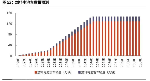 隨著電動車保有量的提升,假設車樁比在 2030 年達到 1:1,則 2060 年充電樁 總數將超過 5 億個。綜合考慮充電樁的新建需求和更換需求,累計新增投資達到 18.15 萬億元人民幣。氫能燃料電池將主要用于重型道路交通(客車、貨車)。假設輕型、中型、大型 貨車的年銷量保持在 150、20、70 萬輛,燃料電池滲透率在 2045 年達到 40%、 60%、80%,而后保持該滲透率;輕型、中型、大型客車的年銷量保持 30、7、 7 萬輛,燃料電池滲透率在 2045 年達到 30%、50%、70%,而后保持該滲透率, 則累計新增投資達到 29 萬億元人民幣。