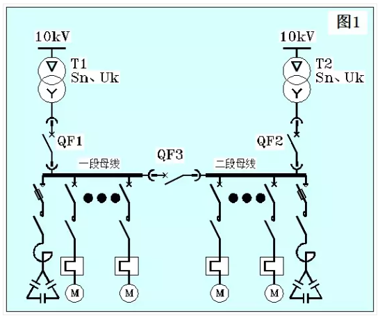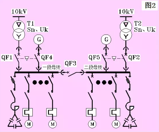 在這張圖中,我們看到了兩臺變壓器,分別標記為T1和T2。于是,兩段進線斷路器QF1和QF2均閉合,而單母線分段的母聯斷路器QF3打開;如果某段進線的變壓器或者中壓側出現問題,例如出現嚴重電壓凹陷(欠壓或者失壓)或者故障,則該段進線斷路器打開,然后閉合母聯斷路器QF3;當系統恢復后,有兩種恢復方法:恢復方法1:將母聯斷路器QF3打開,再閉合對應的進線斷路器。這種方法簡單,但母線上的負載例如電動機在經歷了一次停電重起動后,需要再次經歷停電重起動。恢復方法2:先將對應的進線斷路器閉合,這時變壓器并列運行,然后再將母聯斷路器打開。這種方法稍微復雜,但負載無須經歷第二次停電重起動。