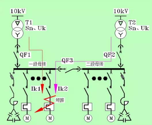 變壓器并列條件同前。在這種條件下,負載側一旦發生短路,短路電流值要乘以變壓器并列的臺數。我們看下圖: