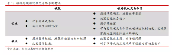 這兩種機制在減排機理上有本質區別。(以下介紹來自華寶證券)碳稅指政府指定碳價,市場決定最終排放水平,故最終排放量的大小具有不確定性;碳排放權交易體系指政府確定最終排放水平,由市場來決定碳價,故碳價大小是不確定的。正是由于這種區別,兩種手段具有不同的特點。開征碳稅更適用于管控小微排放端,碳排放權交易體系則適用于管控排放量較大的企業或行業。這兩種政策是可以結合使用的。