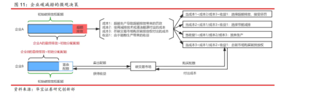 碳排放交易市場,是指將碳排放的權利作為一種資產標的,來進行公開交易的市場。也就是說,碳交易的核心是將環境“成本化”,借助市場力量將環境轉化為一種有償使用的生產要素,將碳排放權這種有價值的資產作為商品在市場上交易。至于碳市場的運行機制,首先,政府確定整體減排目標,采取配額制度,先在一級市場將初始碳排放權分配給納入交易體系的企業,企業可以在二級市場自由交易這些碳排放權。其次,受到經濟激勵、減排成本相對較低的企業會率先進行減排,并將多余的碳排放權賣給減排成本相對較高的企業并獲取額外收益。減排成本較高的企業則通過購買碳排放權來降低碳排放達標成本。按照華寶證券的分析,有效碳市場的碳排放權的價格就是企業的邊際減排成本。在企業微觀決策上,主要是將碳減排成本、超額碳排放成本、購買碳配額的成本與超額排放生產帶來的收益進行比較,并作出相應決策。
