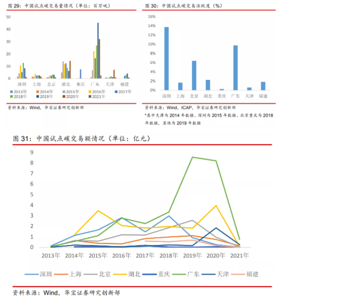 “全國統一碳市場將帶來千億級市場規模,”東方證券新能源分析師盧日鑫這樣估算。在碳排放交易量上,盧日鑫認為,我國目前碳排放總量超過100億噸/年,以2025年納入碳交易市場比重30%-40%測算,未來中國碳排放配額交易市場規模將在30億噸以上,與歐盟總排放量水平相當。在碳排放交易額上,盧日鑫認為,基于中國碳論壇及ICF國際咨詢公司共同發布的《2020中國碳價調查》的研究結果,2025年全國碳排放交易體系內碳價預計將穩定上升至71元/噸,全國碳排放權配額交易市場市值總規模將達到2840億元。按照目前設計規模預測,國融證券認為,全國碳市場市值可能達到1500億元左右,如若考慮到碳期貨等衍生品交易額,規模可達6000億元左右。其中,在碳配額遠期交易方面,根據劉杰的介紹,截至2020年底,上海碳配額遠期累計成交量達到433萬噸,并且幾乎每年都有穩定增長。格林大華期貨研究員紀曉云認為,以歐盟碳期貨交易量是現貨的30倍的標準測算,我國碳期貨的交易量可能達到4000億噸左右。以當前試點碳市場平均50元/噸的價格測算,碳期貨年交易額將達到20萬億元,體量上與橡膠、鐵礦石、銅等品種大致相當。目前,全國共有8個地區在開展碳排放權交易試點,截至2020年11月,各試點碳市場累計配額成交量約為4.3億噸二氧化碳當量,累計成交額近100億元。參與企業獲利嗎?