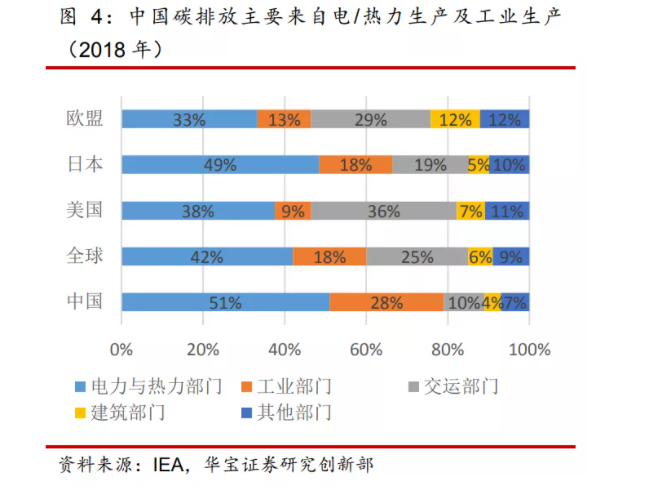 電熱力生產及工業集中用煤、交通領域大量耗油是導致中國碳排放量較大的主因。根據英國BP的2019年數據,中國93%的碳排放來自于化石燃料的使用,其中68% 來自于固體燃料如煤炭,23%來自于液體燃料如石油等,9%來自于氣體燃料如天然氣等。