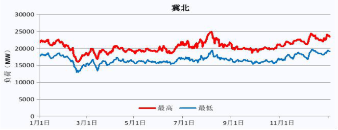全年日最高、最低負荷曲線            用電最高            8月夏季最炎熱的時候用電量最高
