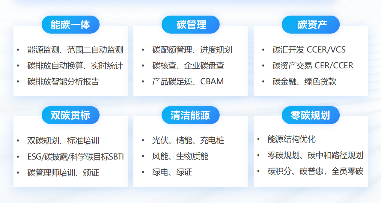 千瓦科技提供全方位的雙碳服務,不僅針對碳市場相關主體,更覆蓋除碳市場之外更廣泛的場景與對象,業務包括但不限于碳監控、碳管理、碳盤查、碳足跡、碳積分、碳資產開發、碳培訓、碳申報、碳認證、ESG信息披露等,助力各類主體開展碳中和建設。
