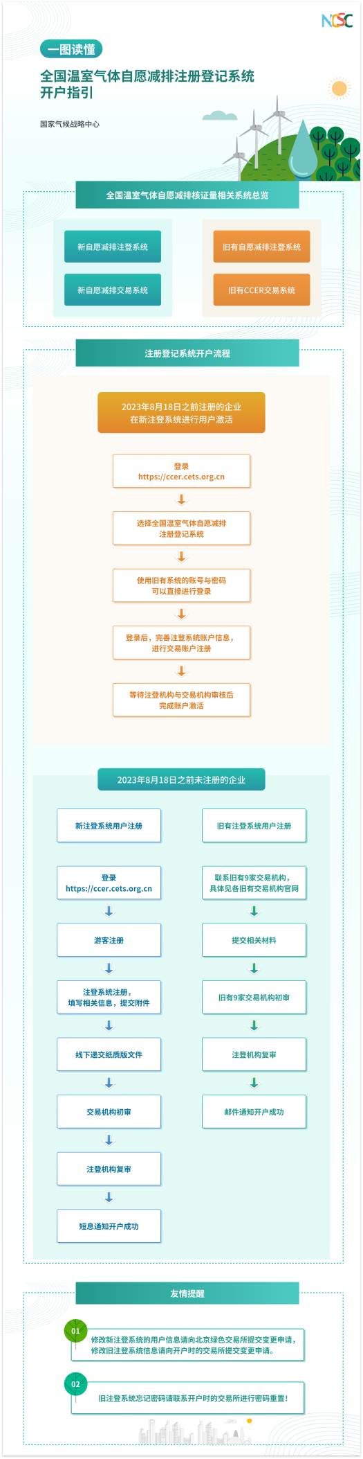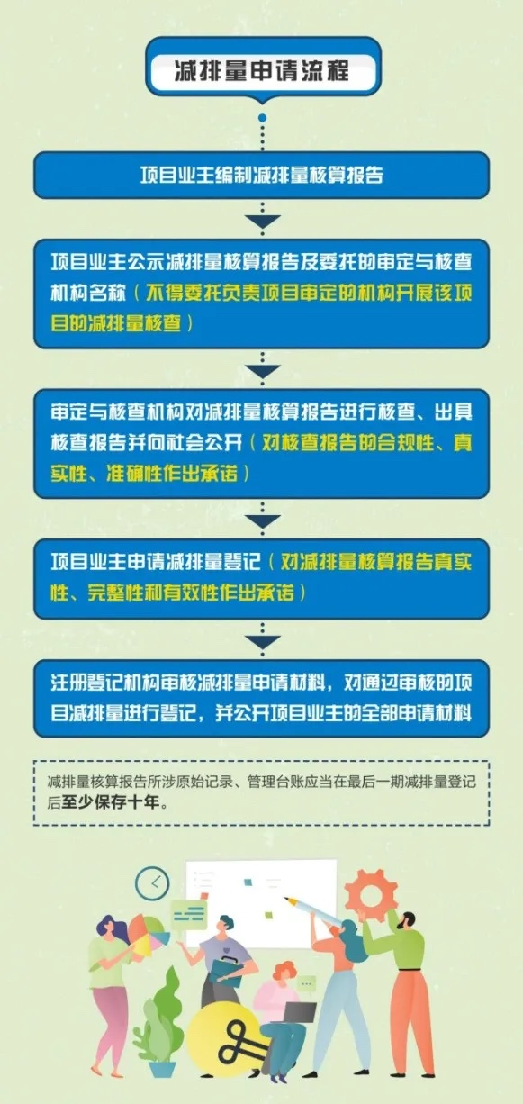 自公告發布日起,國家氣候戰略中心正式受理相關申請,請項目業主、國家認證認可監督管理委員會審批的溫室氣體自愿減排項目審定與減排量核查機構,登錄全國溫室氣體自愿減排注冊登記系統及信息平臺,進行線上開戶及項目登記申請(訪問地址:https://ccer.cets.org.cn/)。