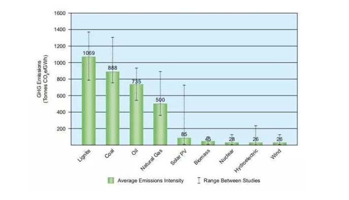 世界核能協(xié)會(World Nuclear Association)的統(tǒng)計與綜述結(jié)果,光伏發(fā)電全壽命周期內(nèi)的排放低值為13,中值85,高值731。