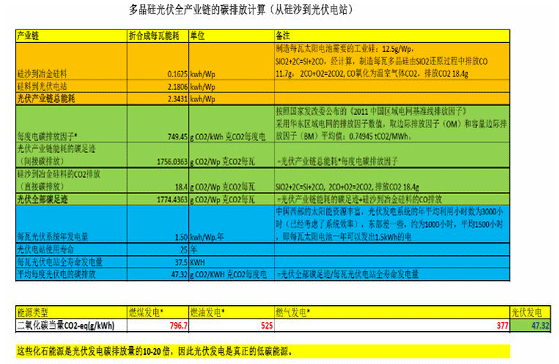 經(jīng)計算,從多晶硅光伏全產(chǎn)業(yè)鏈(硅沙-光伏電站系統(tǒng))來看,平均每度光伏發(fā)電的碳排放為47.32g CO2/kWh。