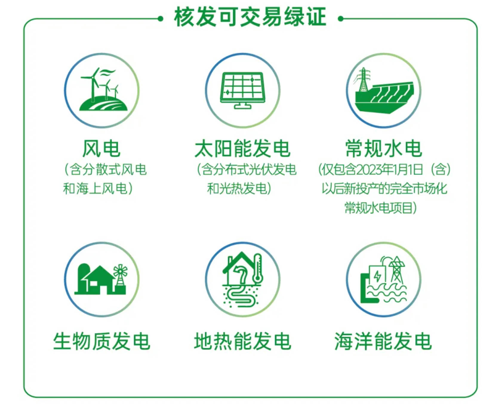 全國已建檔立卡的可再生能源發電項目所生產的全部電量,實現綠證核發全覆蓋。核發范圍如下圖所示: